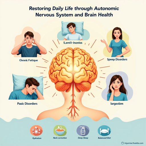 현대인의 다양한 만성 증상은 자율신경 불균형과 뇌 기능 저하로 연결됩니다. 해결의 핵심은 증상 억제가 아니라 원인 교정입니다. 다음의 통합 전략을 권장합니다. ① 목 건강 회복(거북목·일자목 교정, 경추 안정화)로 뇌 혈류 개선 ② 수분 관리로 염증 부하 감소 및 수면 질 향상 ③ 수면 위생(편한 누운 자세, 늦은 카페인 제한, 빛·온도 최적화) ④ 소화 효율(식후 이완, 점심 탄수 조절, 단백질·탕류 중심, 장 기능 회복) ⑤ 자율신경 밸런스(긴 호흡, 가벼운 유산소, 흉곽 확장 스트레칭). 일상의 작은 습관 교정이 누적되면 뇌-자율신경 회로가 안정화되고 전신 컨디션이 반등합니다.